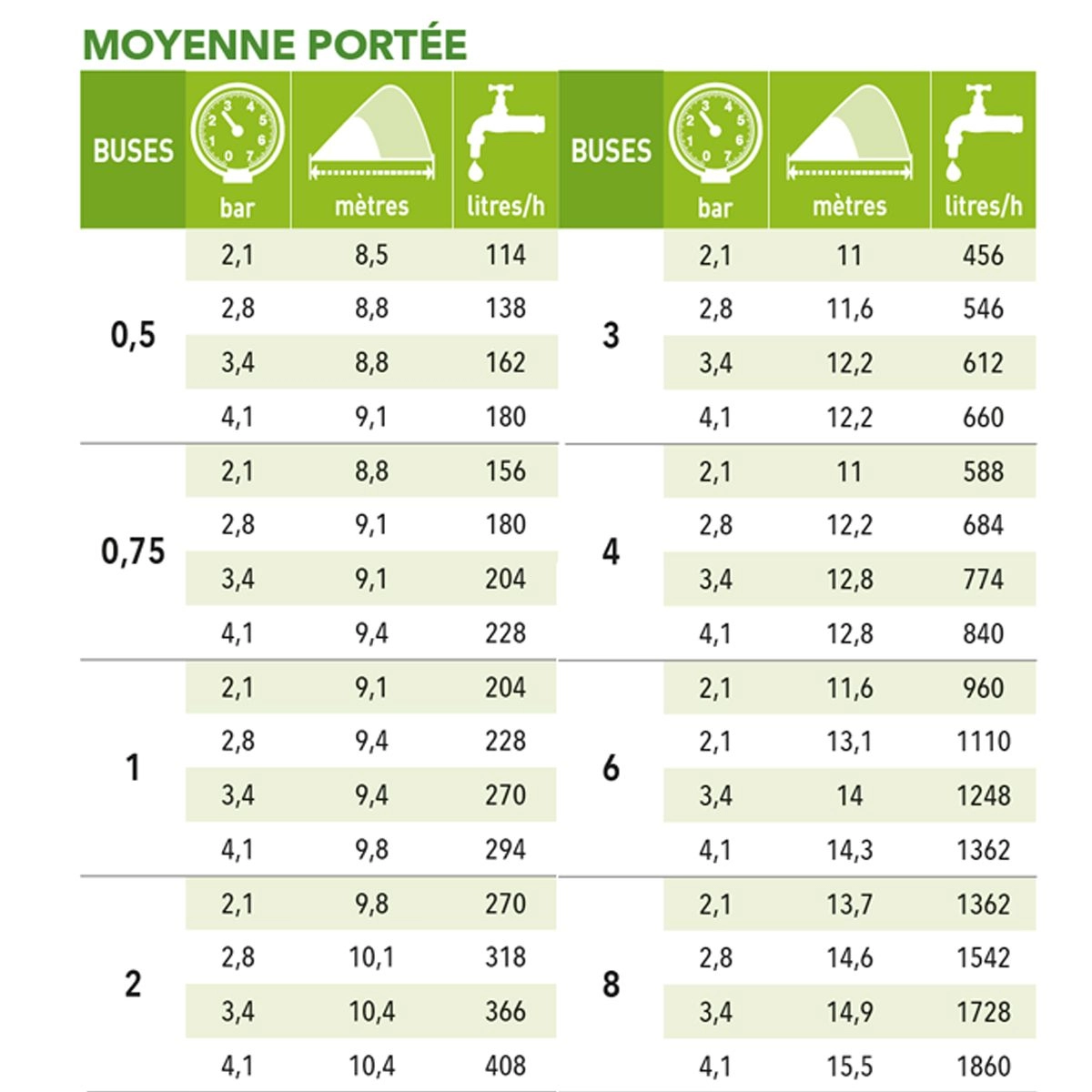 Elle permet de couvrir une zone de 6,7 à 15 m de rayon pour une pression de 2,1 à 4,8 bars.